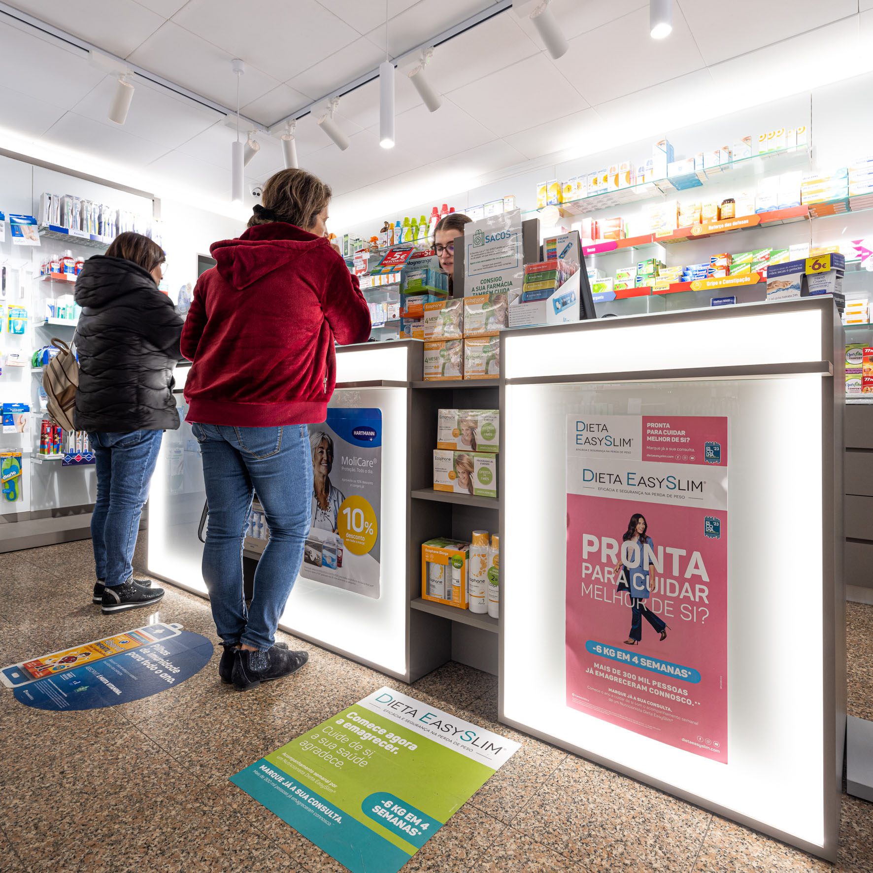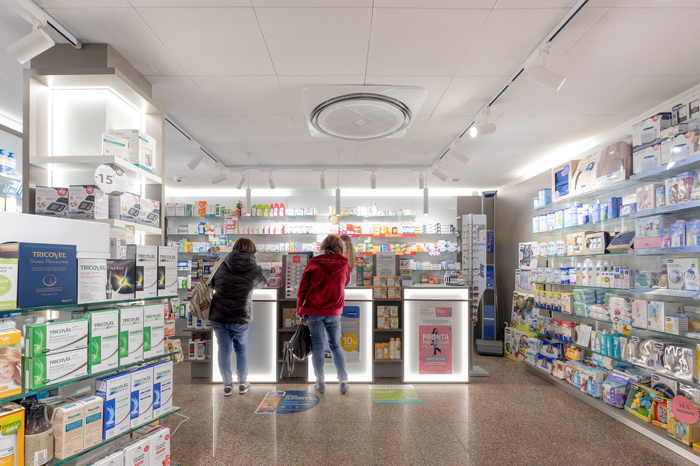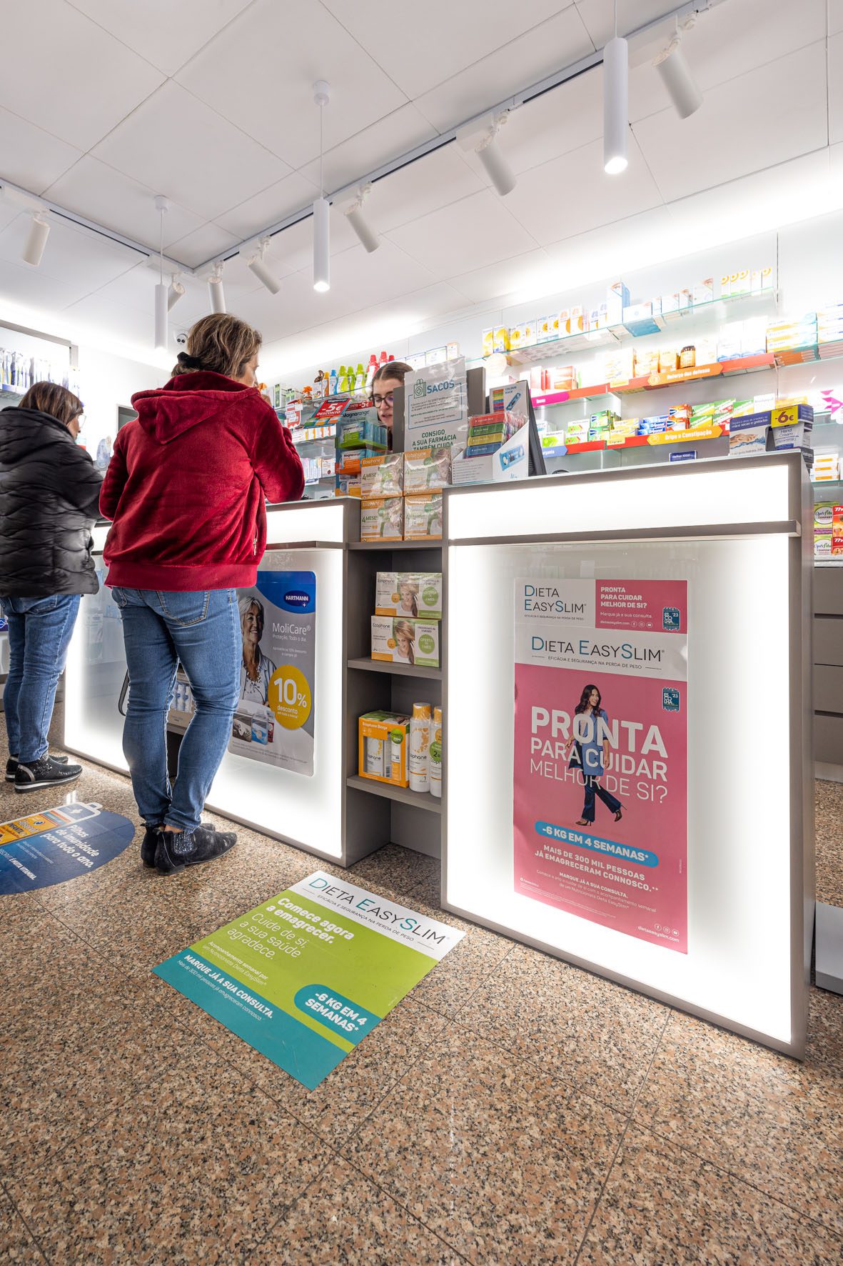 A harmonia visual é obtida graças à mistura de elementos brancos e cinzas metálicos. Os novos balcões de atendimento foram especialmente desenhados a pensar nos fluxos de trabalho e no conforto dos clientes. O design diferenciador confere um toque moderno ao ambiente farmacêutico e potencia a jornada de compra com a oferta de produtos e promoções que vão ao encontro das necessidades do consumidor.