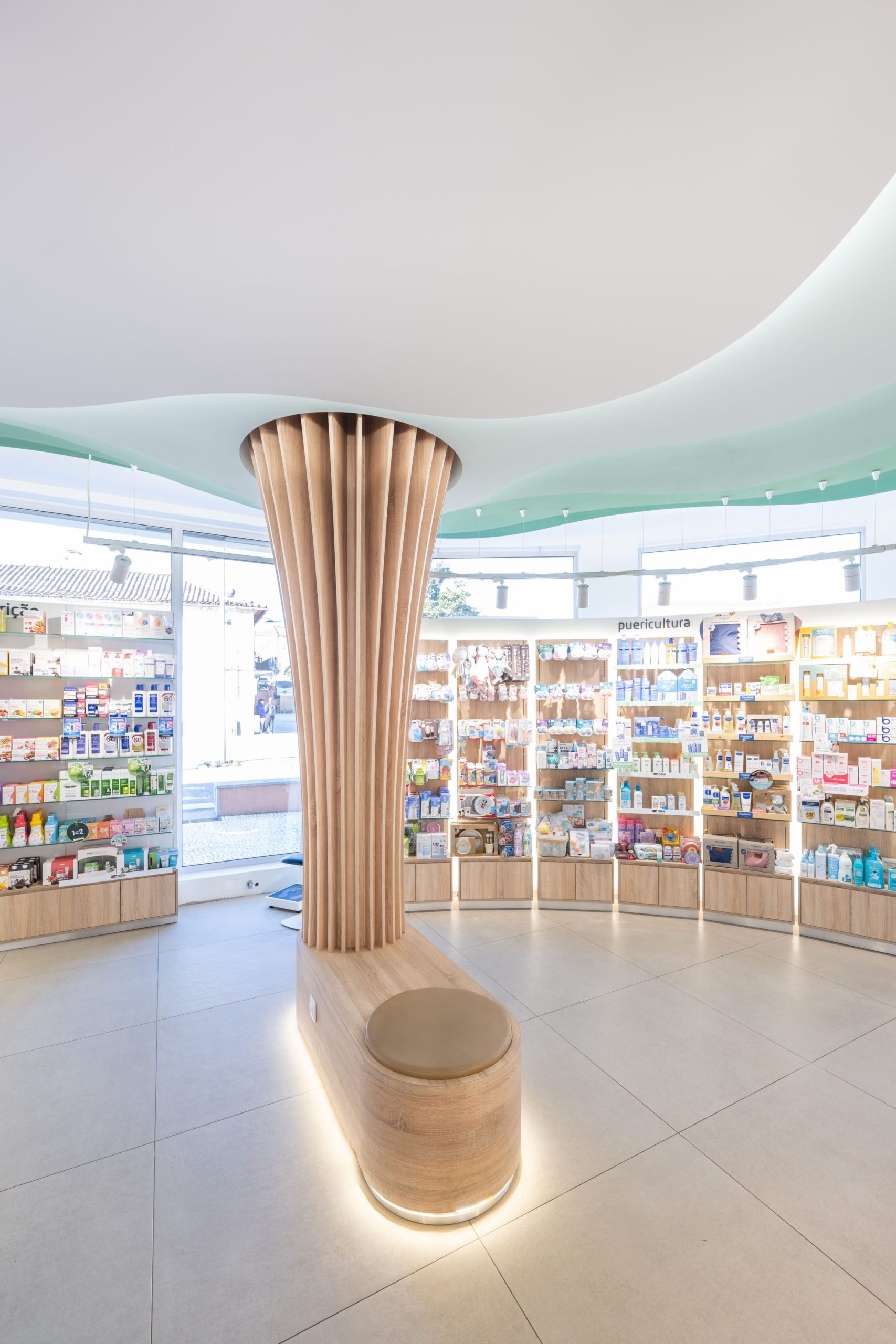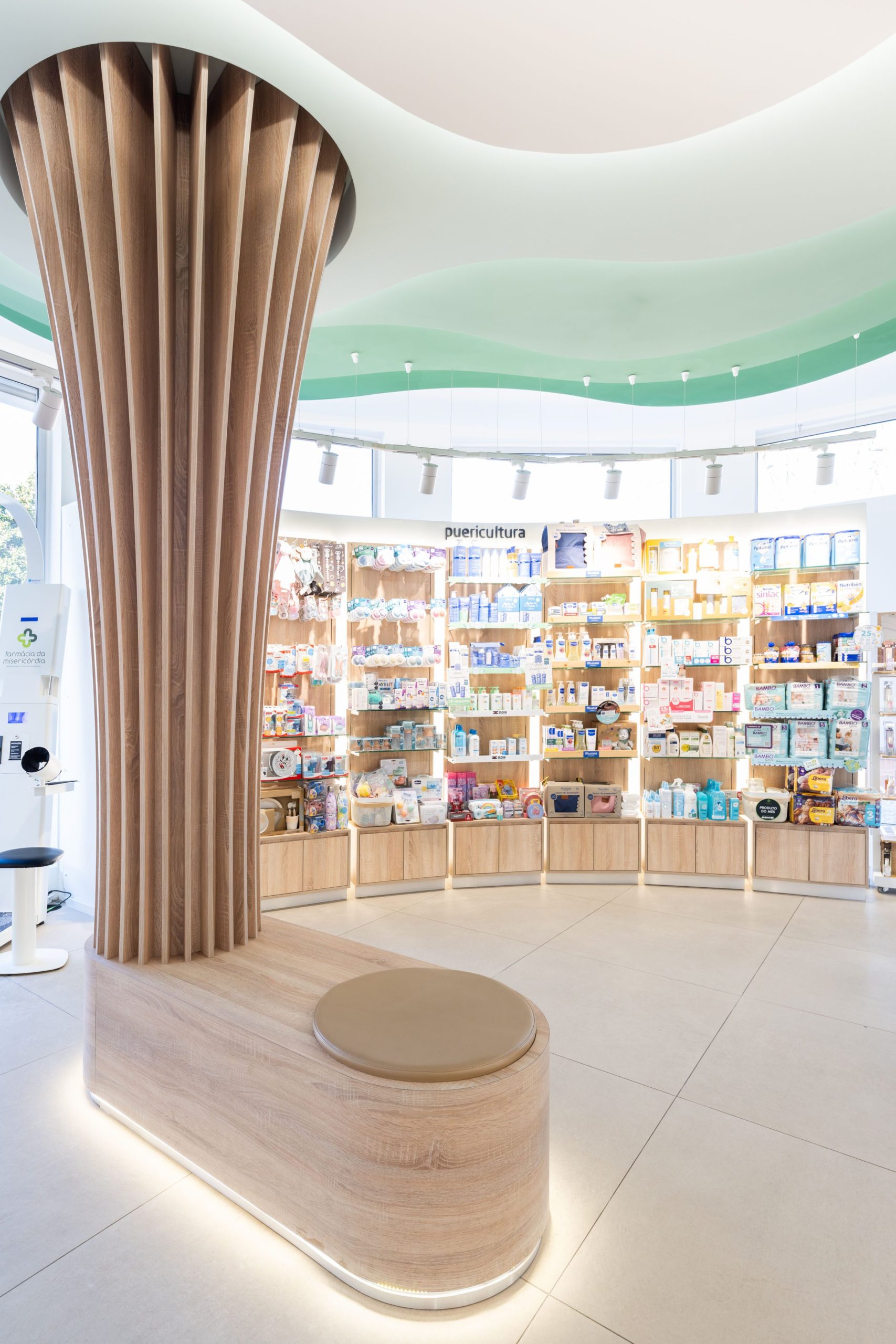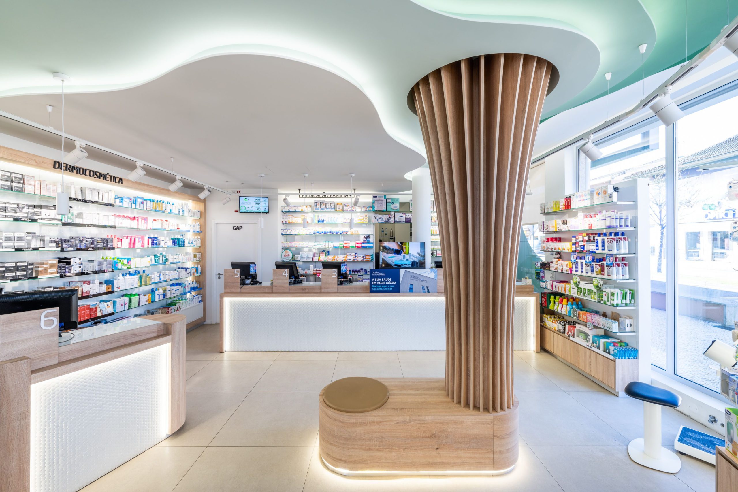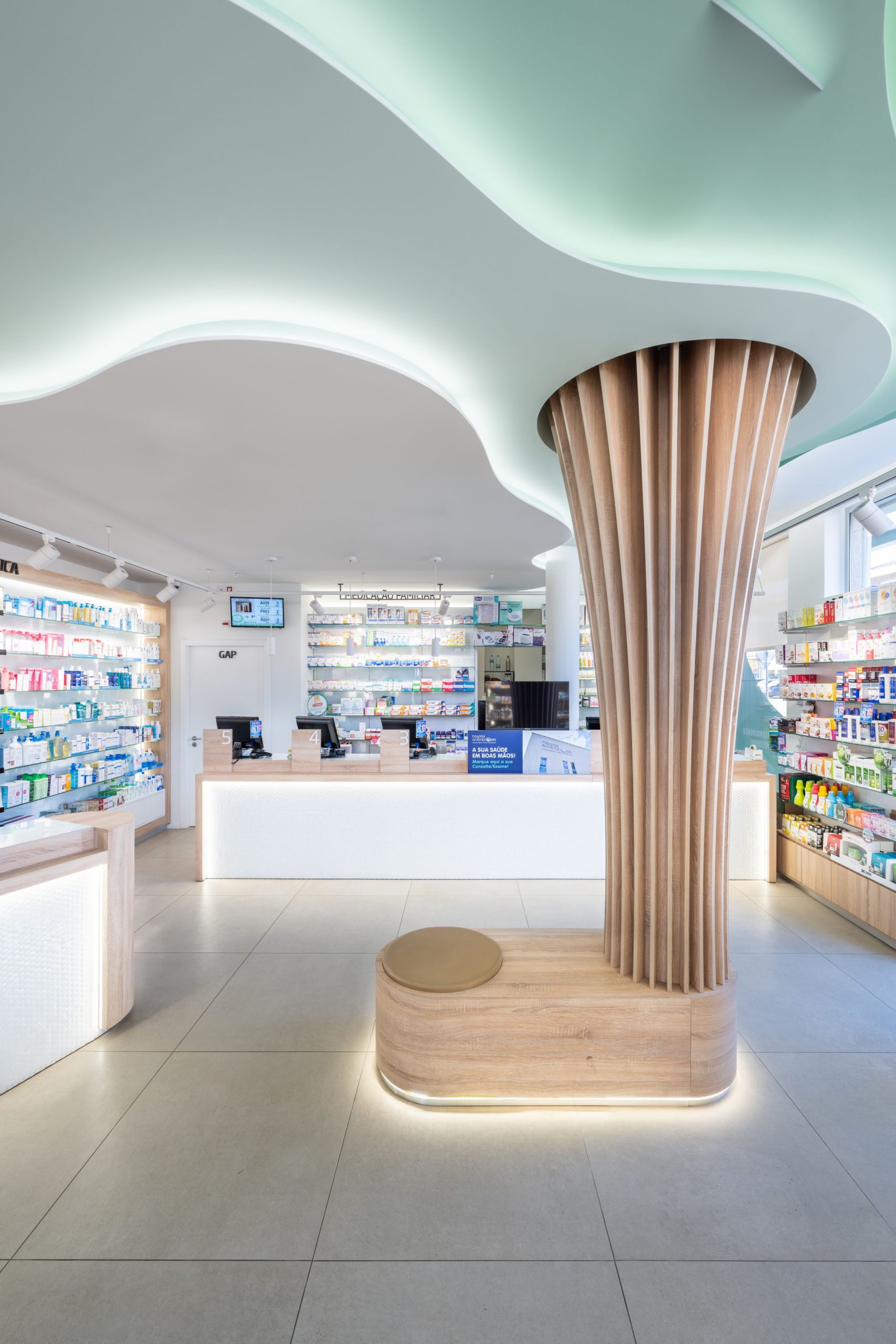 O elemento central da Farmácia da Misericórdia – uma instalação que replica a estrutura de uma árvore – capta a atenção dos utentes. O pilar de madeira une-se ao teto numa dinâmica muito fluída, reforçada pelo degradê iluminado que imita as folhas da árvore. Esta peça potencia o espaço orgânico da farmácia ao garantir maior fluidez e proximidade ao conceito de sustentabilidade.